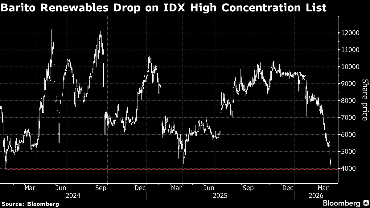 Shares of PT Barito Renewables Energy tumbled Monday to their lowest in more than two years after the Indonesian stock exchange flagged the company for having a highly concentrated shareholder base.
